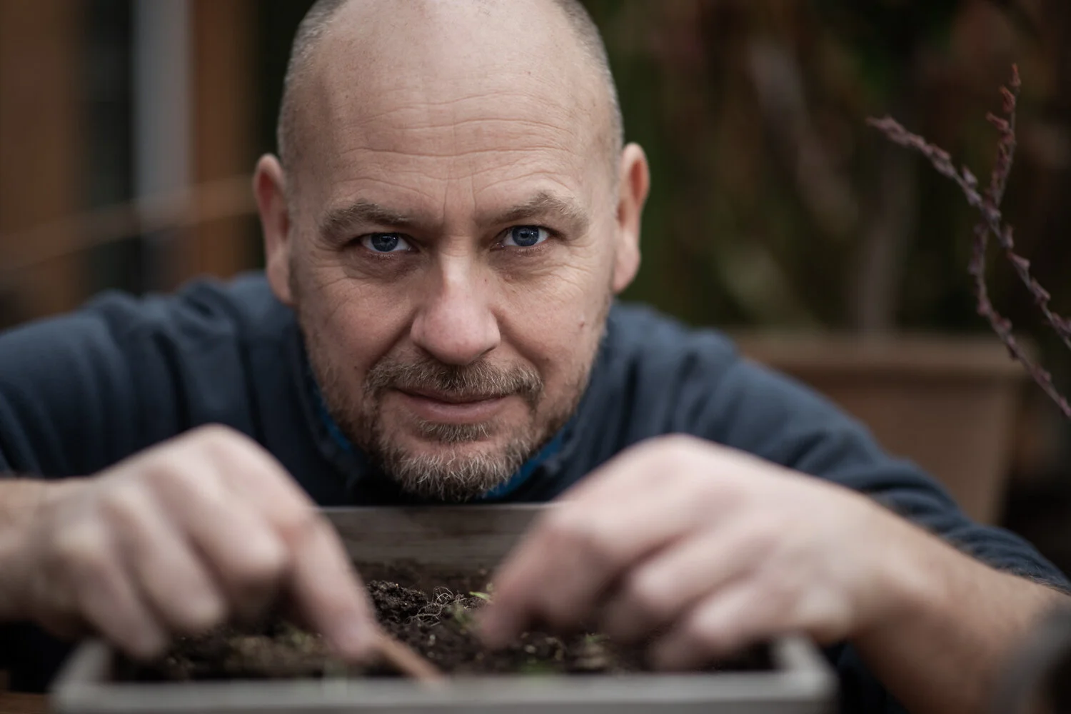 A self portrait for my garden photography focused blog and social media. Notice the eye contact and there is a hint of context in the image with it being set in the greenhouse pricking out seedlings.